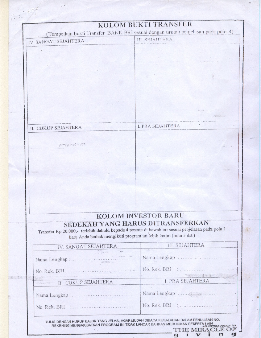 Yakinlah anda akan memperoleh hasil dari sedekah anda tersebut. Skema piramida bermodus ebook dengan sistem penjualan berjenjang. Brosur program investasi sedekah (the miracle of giving) ini pertama kali penulis dapatkan secara ofline dari teman kemudian.
